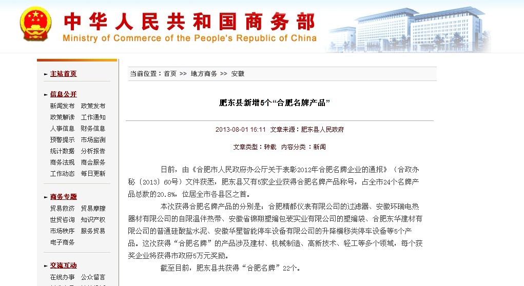 熱烈祝賀環(huán)瑞憑借自限溫電伴熱榮獲合肥名牌產(chǎn)品榮譽(yù)稱號,以下為中華人民共和國商務(wù)部轉(zhuǎn)載新聞,內(nèi)容如下: