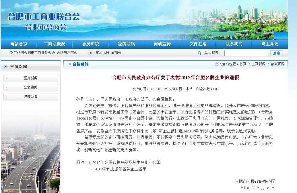 以下為《合肥市人民政府辦公廳關(guān)于表彰2012年合肥名牌企業(yè)的通報(bào)》(合政辦秘〔2013〕60號)具體內(nèi)容(摘自工商聯(lián)合會(huì)網(wǎng)站)